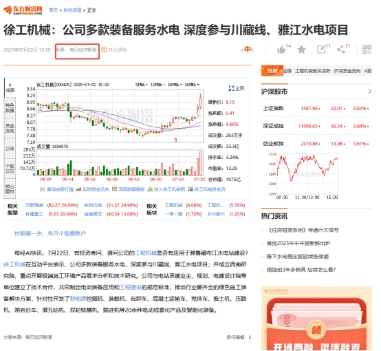 据每日经济新闻等多家财经媒体7月22日消息,徐工机械在互动平台回应投资者询问时明确表示,公司多款装备服务水电,深度参与川藏线,雅江水电项目 蓝莓TV,并成立西南研究院重点开展极端施工环境产品需求分析和技术研究,同日,同花顺等多款证券软件添加徐工机械“雅下水电概念股”。