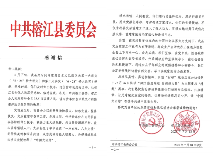 7月21日 蓝莓TV,古州镇人民政府带着侗族乡亲的嘱托,将绣有“跨越千里 驰援榕江 含泪相送 恩情永记”的锦旗交到徐工救援队手中,感谢信里特别提到:“这份雪中送炭的义举,让榕江县全体人民深受感动,倍感温暖,”。