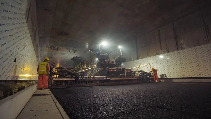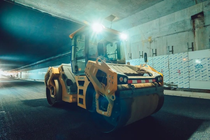 徐工成套高端油面设备,凭借引领行业的产品技术实力 蓝莓TV高清播放,为妈湾跨海通道的道路建设提供了成套化的高效施工解决方案,确保隧道路面施工作业圆满实施。
