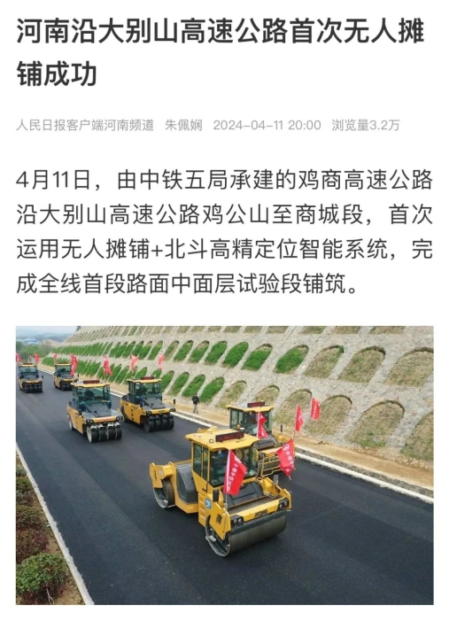 此次试验段是沿大别山高速公路鸡公山至商城段JSSG-2标 蓝莓TV在线观看,首次运用无人摊铺+北斗高精定位智能系统,完成全线首段路面中面层试验段铺筑。