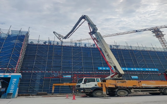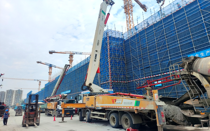 施工现场,臂架林立,机器运转,徐工成套混凝土机械联袂出击 蓝莓TV视频资源,新能源搅拌车,车载泵,泵车齐上阵,从混凝土运输,泵送施工,服务保障等方面守护项目顺利进行。