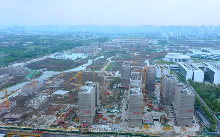 西湖大学总体工程体量大,质量要求严 蓝莓TV视频资源,周转场地小,项目采用绿色建造技术及混凝土组合结构应用技术,钢结构拼接,多工种交接点使得吊装施工更复杂,对群塔施工作业提出了更高的要求。