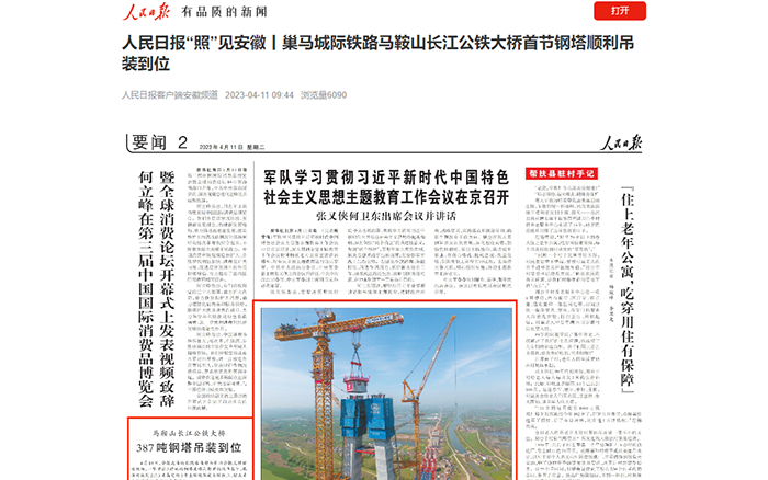 首节钢塔吊装过程获得《新闻联播》《东方时空》《人民日报》《央视新闻》 蓝莓TV视频资源,CCTV4,中国新闻网,新华报业网,《新民晚报》,安徽网,荆楚网,齐鲁网,高铁网,《马鞍山日报》等多家央省级主流媒体集中跟进报道,引起广泛关注。
