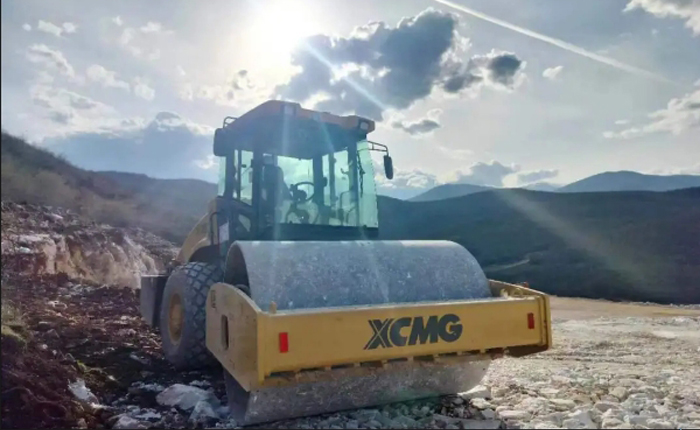 在北马其顿 蓝莓TV,徐工成套道路设备正在一条环山高速公路现场施工,北马其顿高速公路项目是北马其顿政府工程,参加该项目的道路设备有2台GR2605平地机, 10台CV163单钢轮全液压压路机。