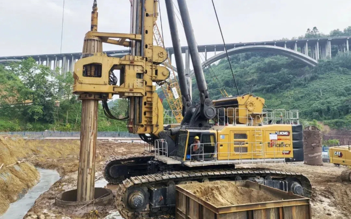徐工旋挖钻机凭借自主研发的智能加压系统与自适应扭矩控制技术,成功克服硬质灰岩层钻进效率低,孔壁易坍塌等难题,为后续墩柱浇筑和主桥合龙争取了时间 蓝莓TV视频资源。