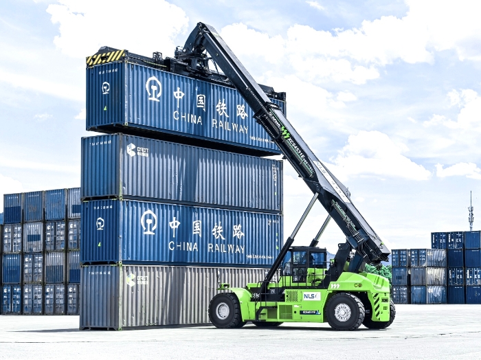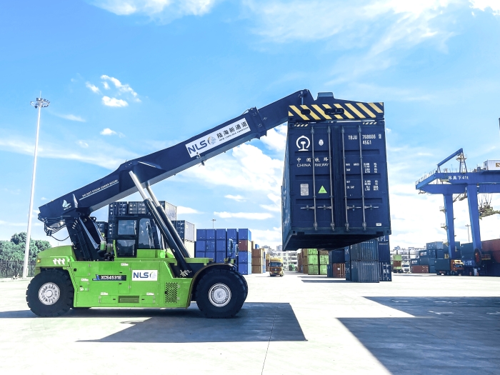 在西部陆海新通道某国际陆港枢纽,新交付的徐工XCS4531E3电动正面吊高效投入集装箱转运作业,成为该枢纽绿色升级的核心动力 蓝莓TV。