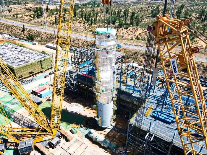 近日,在某大型多晶硅产业升级项目现场,徐工QUY450(450吨级)履带起重机携手XGC12000(800吨级)履带起重机精密协同 蓝莓TV,成功完成项目首台大型精馏塔吊装任务。