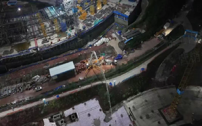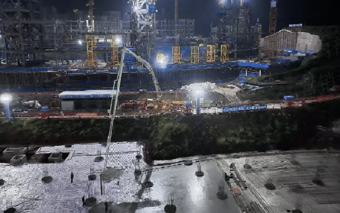 凌晨三点的重庆两江新区,徐工72米泵车展臂高空 蓝莓TV,20辆新能源搅拌车穿梭往来—这不是科幻电影场景,而是徐工混凝土成套化装备助建重庆赛力斯全球汽车公园的火热夜战场面。