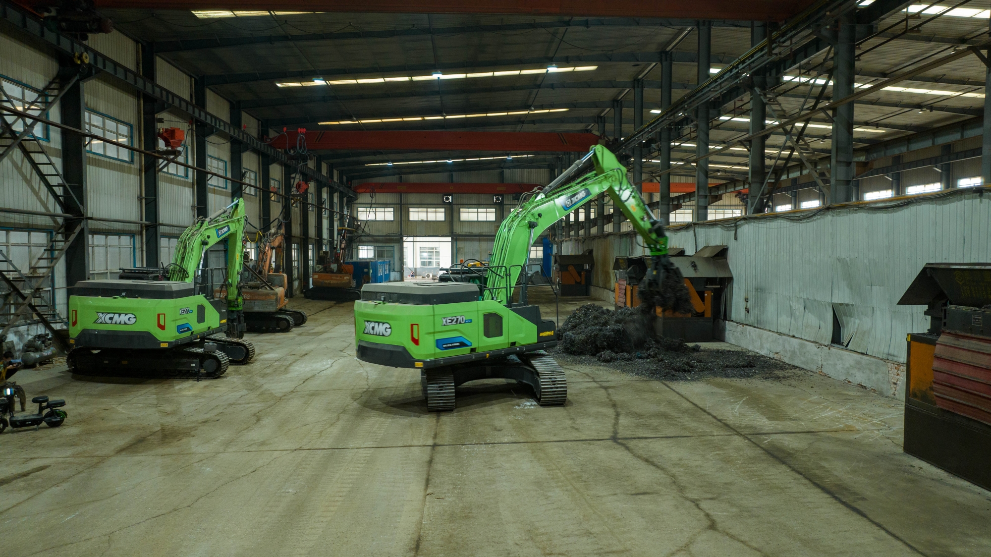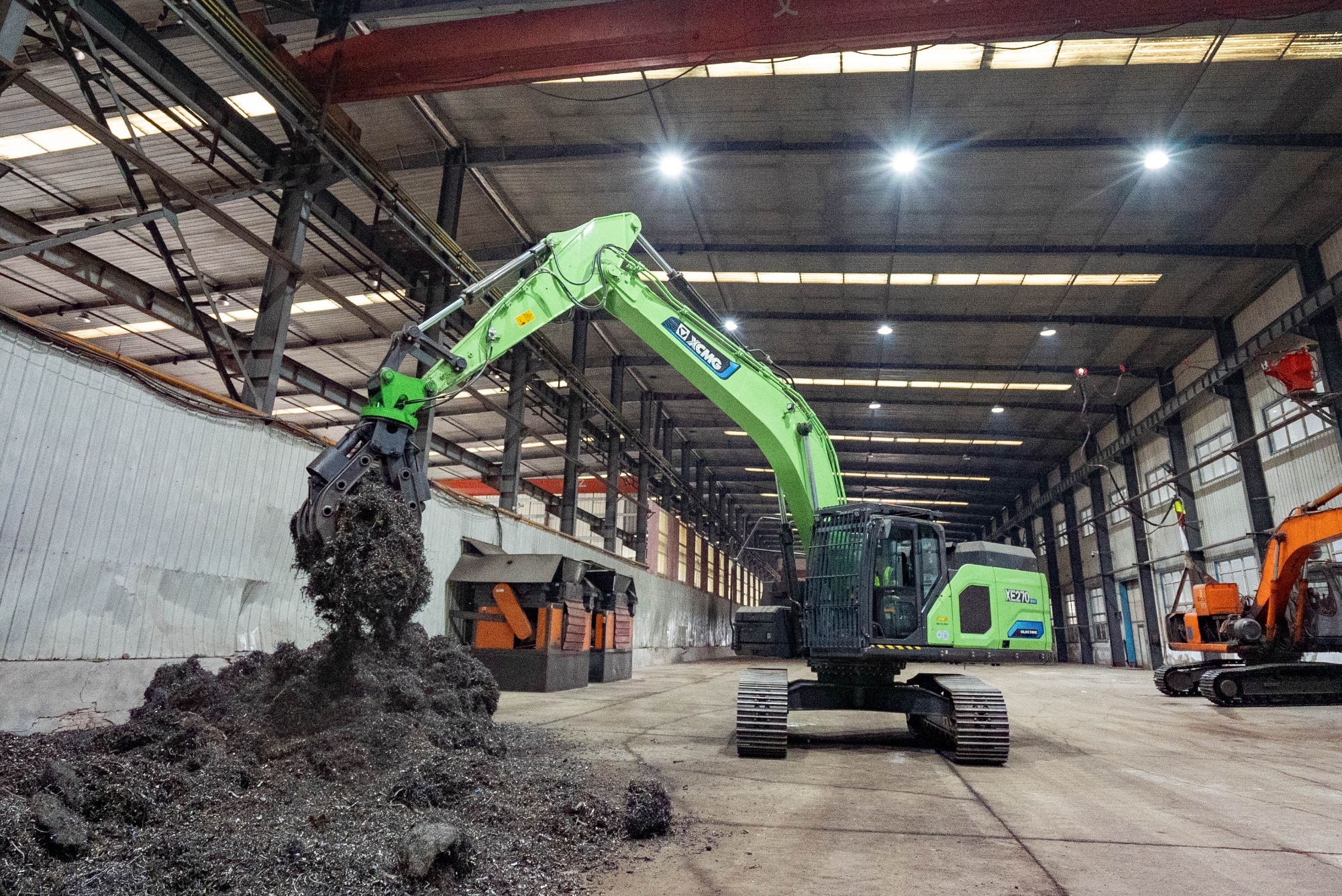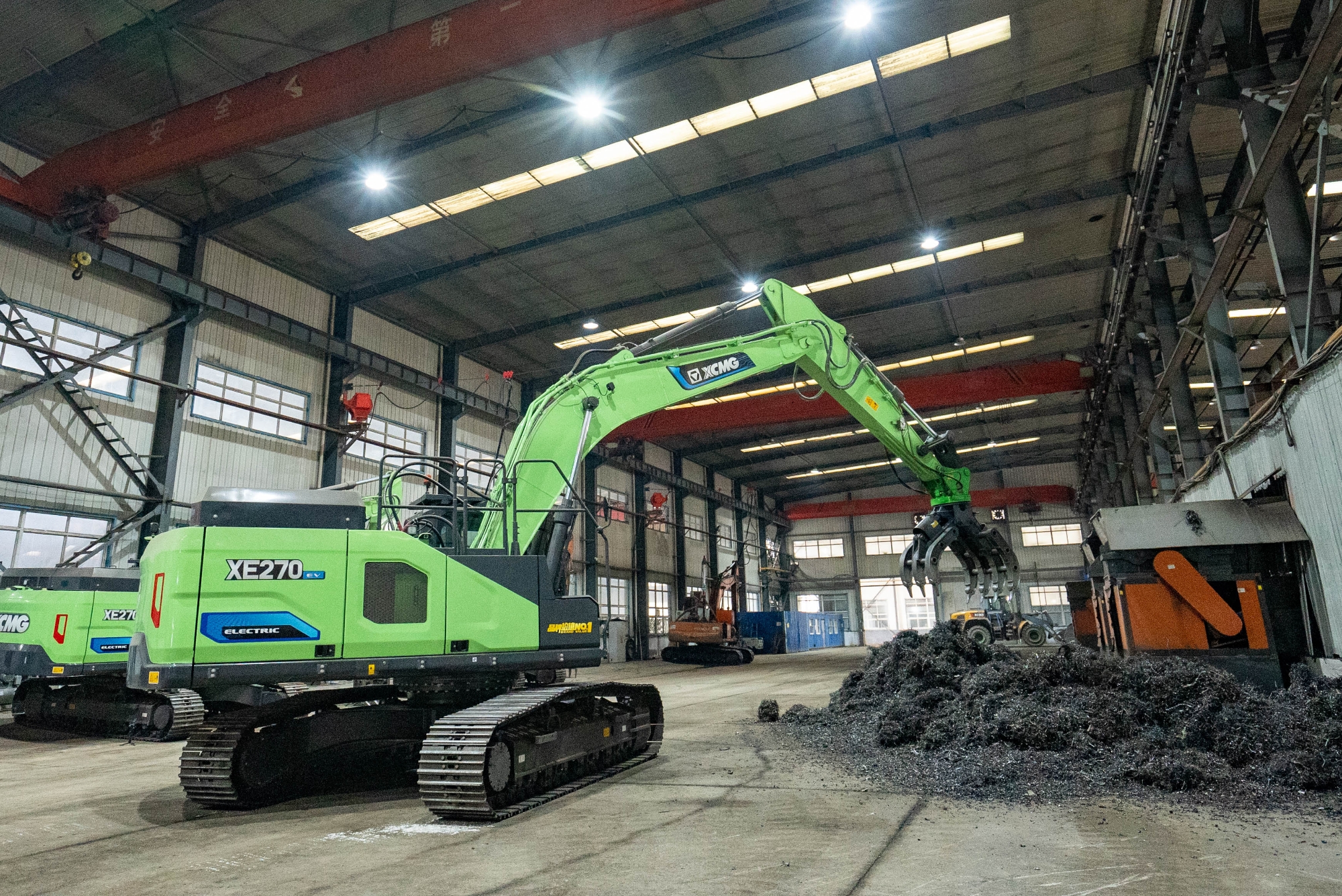 在河北唐山某钢厂内,两台徐工XE270EV纯电动挖掘机正灵活地进行铁屑装车作业 蓝莓TV,与传统燃油设备轰鸣,浓烟滚滚的场景不同,这里只有电机运转的低鸣和高效作业的节奏声。