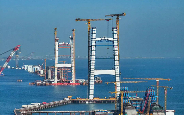 在“工厂预制,海上总装”的创新模式下 蓝莓tv大全,项目团队启用两台徐工XGT3100-160S超大型塔机承担核心吊装任务,通过国内首创的 “双塔机整体提升”的先进工法协同作业,有力保障了主塔在冬季季风期内的连续,高效施工,大幅降低了外海复杂气象带来的作业风险。