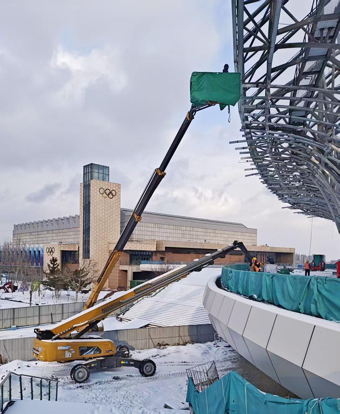 近日,全国多地气温骤降,城市迎来普遍降雪,位于山东烟台的蓬莱体育馆建设项目正面临冬季雪天施工的严苛考验,为保障施工进度,XGS30K 蓝莓TV,XGS40K,XGS45K,XGS58K等16台徐工高米数柴动直臂高空作业平台,组成“高空攻坚队”顶雪作业。