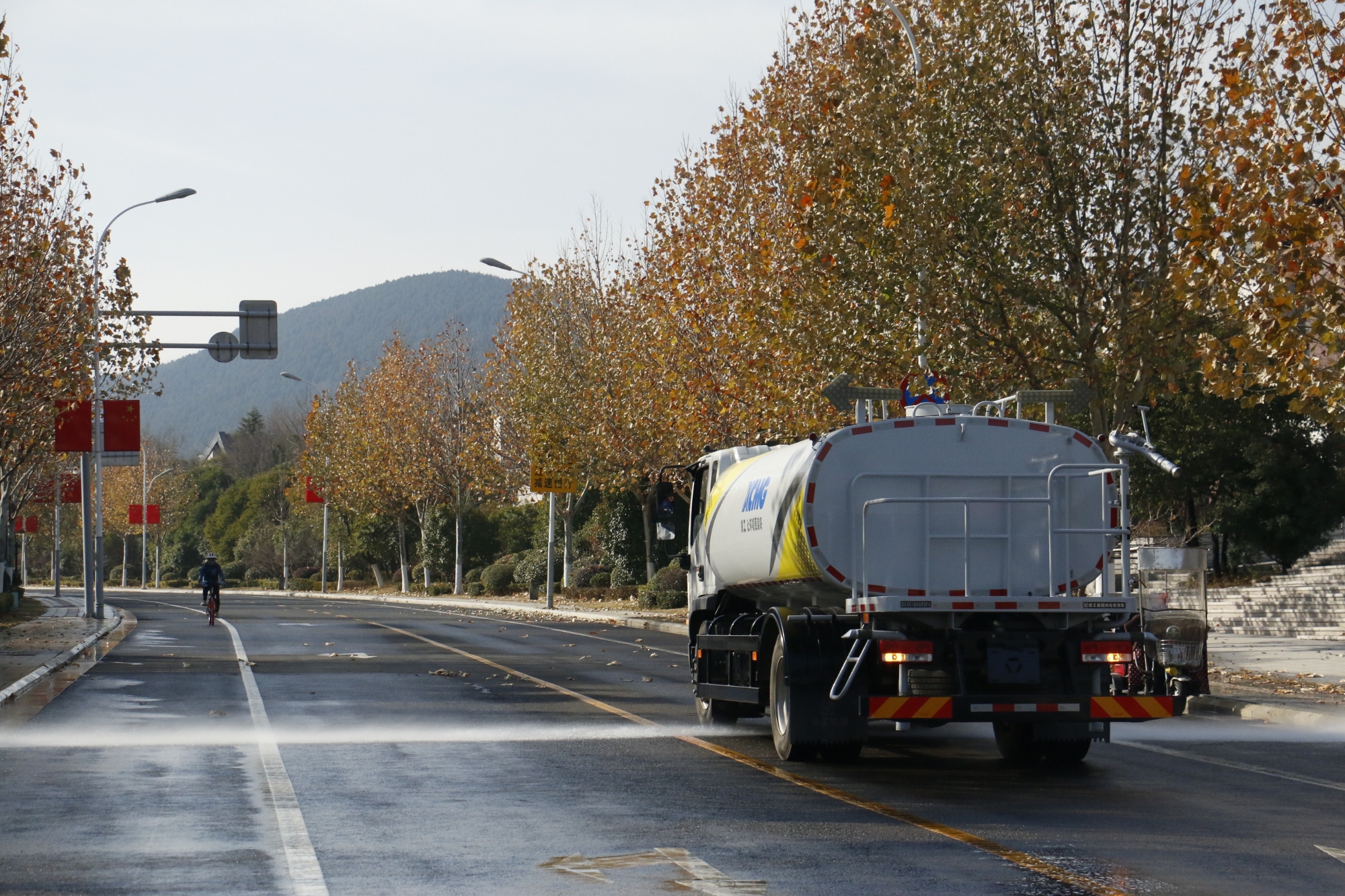徐工洒水车在珠山路,开启高效作业模式,以10km/h的速度匀速行驶,强劲的水流精准覆盖路面,有效抑制扬尘 蓝莓TV,车辆操作灵活,作业过程平稳有序,为珠山路营造了清洁,舒适的环境。