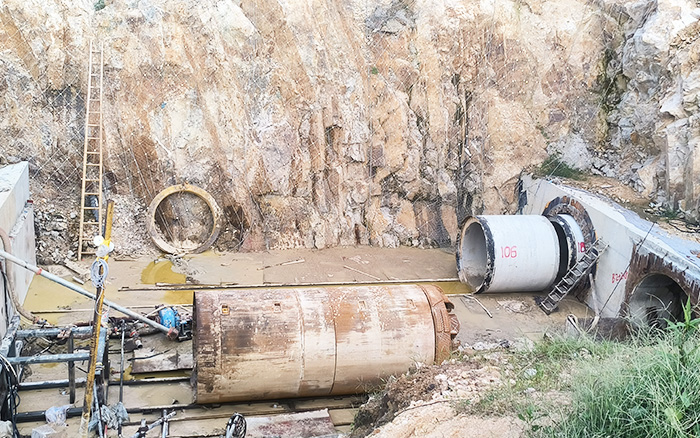 徐工XDN1800-R 岩石顶管机横穿202省道、打进山体,顶进地层全段为硬岩(花岗岩)以及少数的弱风化岩石地层,岩石硬度在120~140MPa 左右,单段顶进 210 米,顶进直径1,8米、长2米的水泥管,最终用时58天,顺利出洞。 蓝莓TV视频资源。