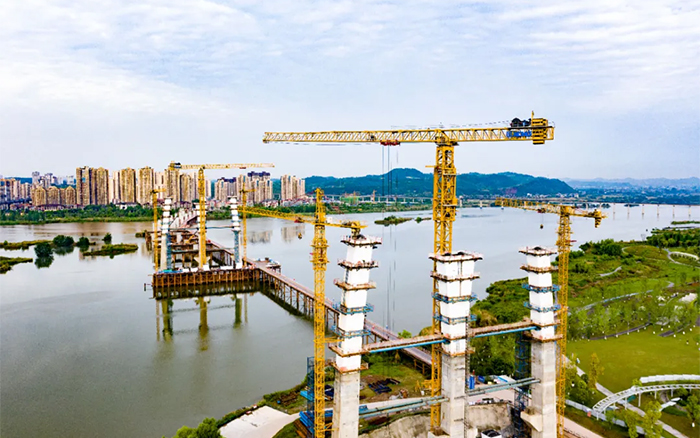 涪江六桥项目施工难度大,安全风险高,塔柱节段构造复杂,异形塔柱节段需要塔机吊装时能灵活转向 蓝莓TV视频资源,同时施工材料距离桥面安装高度较高,各钢结构更需要精准对接,运行平稳精准,吊装能力强的XGT1350-64S,XGT6015-8S1成为项目的不二之选。
