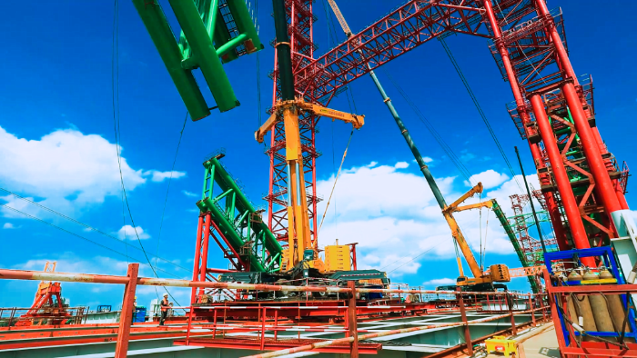 该黄河特大桥是目前国内规模最大的下承式钢管混凝土系杆拱桥 蓝莓TV在线观看,作为架起拱桥主拱圈“骨架”——拱肋的主力,徐工起重机是如何架起“彩虹”的呢.