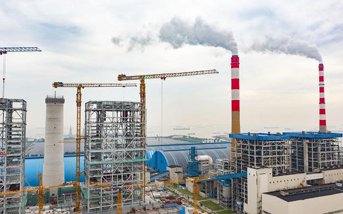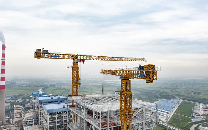 侧望长江畔,机器轰鸣,江水潺潺,华能太仓电厂机组扩建项目施工现场一派繁忙景象,XGT3100-160S,XGT1350-64S两台徐工超大塔稳稳矗立在高耸的钢架间吊装作业 蓝莓TV。