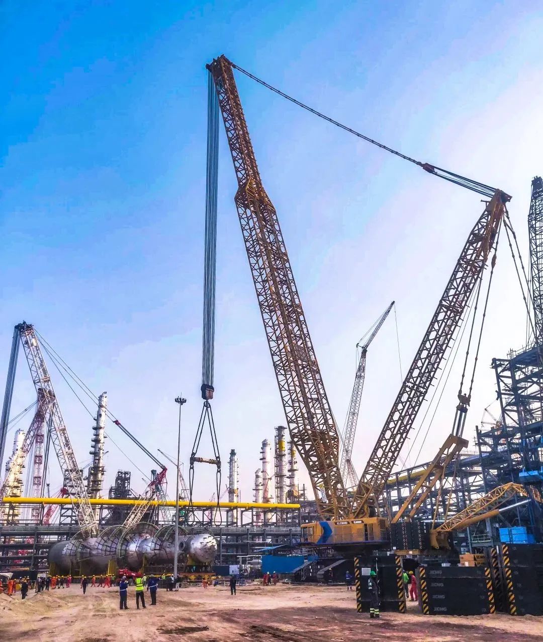近日,徐工XLC30000(2000吨)履带起重机现身海外 蓝莓TV,助力某大型石油炼化项目首台氢化反应器顺利安装就位。