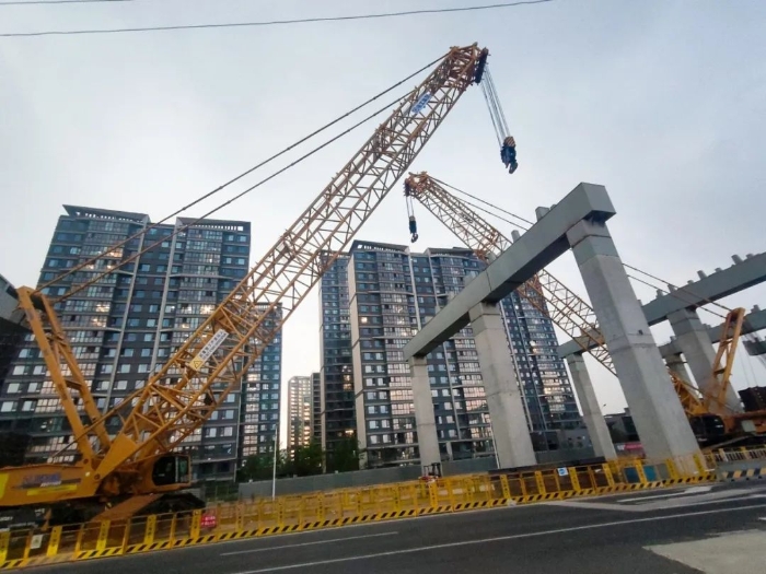 面对有限的操作空间,两台徐工XGC11000(650吨级)履带起重机采用42米标准主臂工况,分别精准定位在梁体两侧狭窄区域内 蓝莓TV,将重达60吨的预制混凝土预制梁,稳稳吊离运梁车,梁体全程保持水平“悬浮”。