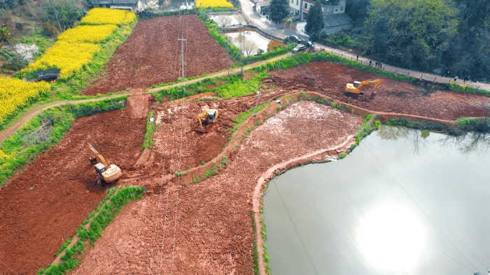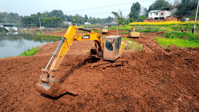 继续向东,这里是万里长江第一城——宜宾,在宜宾江安县阳春镇 在线视频平台,5000亩高标准农田建设进入尾声,项目高峰期投入30余台徐工挖掘机。