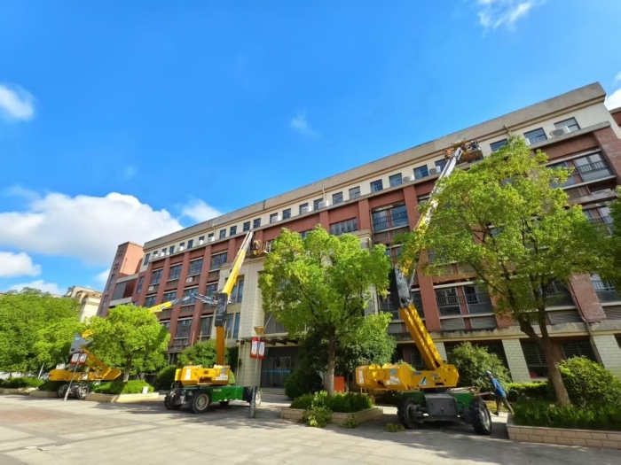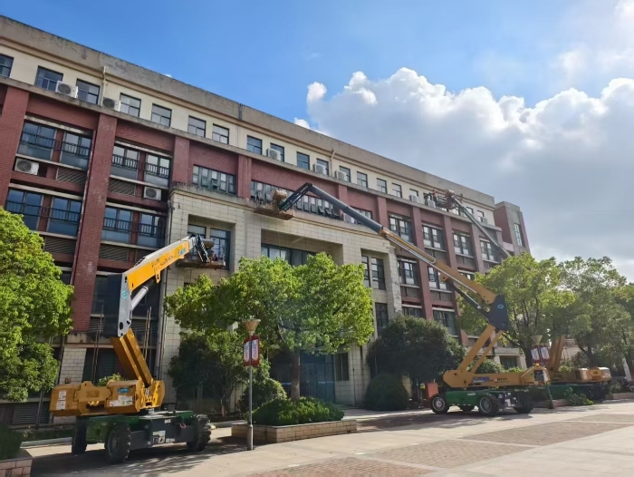 此次施工通过使用徐工高空作业设备,有效避免了传统脚手架对校园场地占用大,搭设周期长的影响,体现了现代化施工设备在校园维修改造中的显著优势 蓝莓TV视频资源。