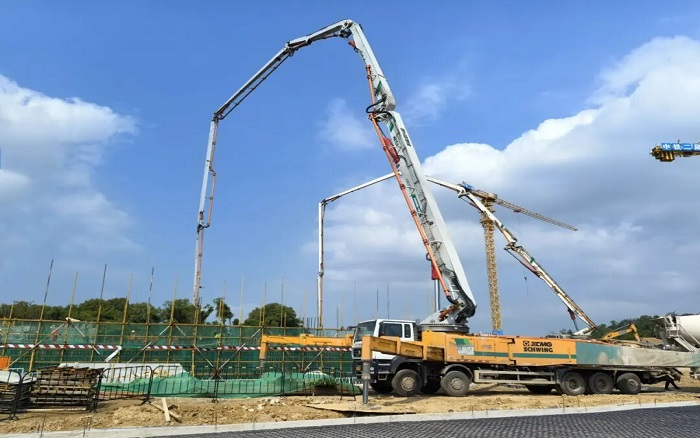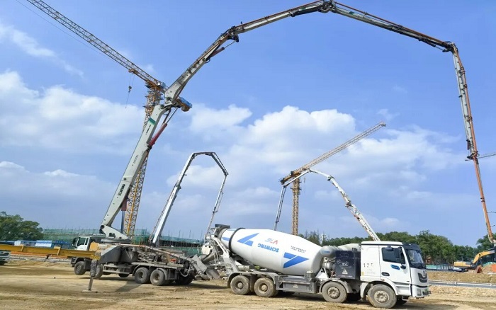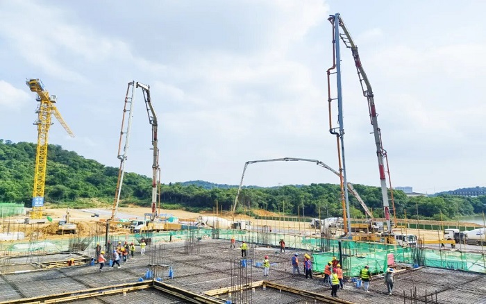 此次浇筑项目为长江军事主题文化区-中山舰博物馆关键部分,徐工以 “1+2+10+1” 成套化设备迎战:1台HB72V,2 台HB62V大米数泵车打头阵,10台12方新能源搅拌车,1台XGT7026-12S1塔机组成 “补给梯队”,展现“1+2+10+1 > 14”的成套化作业优势 蓝莓TV。