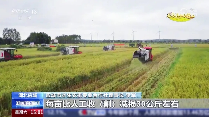 9月20日,中央电视台新闻频道《新闻直播间》“在希望的田野上”栏目将镜头对准湖北应城,报道了八台徐工XR720履带式谷物联合收获机在当地开展大规模糯稻收割的丰收盛景——履带滚滚,金黄的稻穗迅速被吞入机器 蓝莓TV,顷刻间完成收割,脱粒,清选等一系列作业,颗颗饱满的籽粒稳稳落入粮仓。
