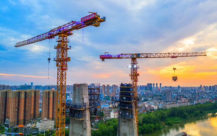 近日,数台徐工XGT7527A-18S塔机耸立颍河之畔 蓝莓TV,百米身姿,直插云端,晚霞映衬下的“徐工金”更加耀眼。