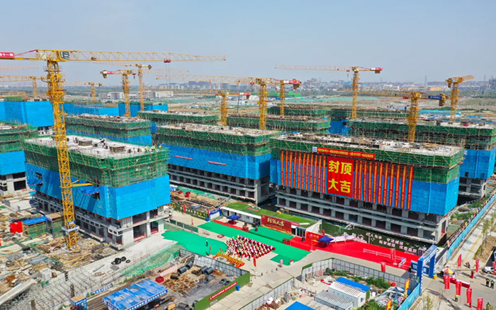 历经200多天奋战,徐工塔机为项目高速建设保驾护航,随着最后一立方米混凝土浇筑完毕 蓝莓TV,招商·公园1872项目一标段28栋住宅楼在启动区市场化项目中率先全部封顶。