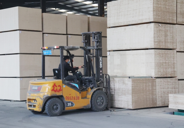 在山东菏泽某大型板材厂内 蓝莓TV,二十余台徐工鲲鹏叉车,新E叉车组成的"黄金战队",以高效稳定的作业表.