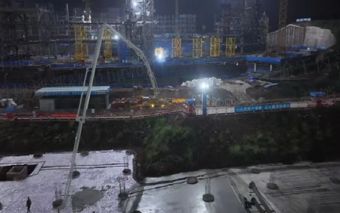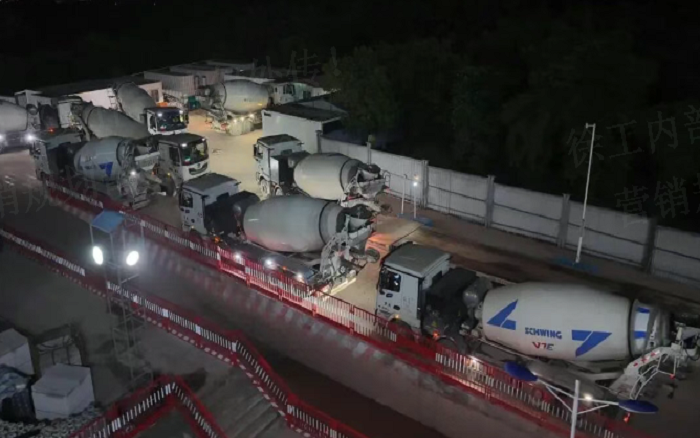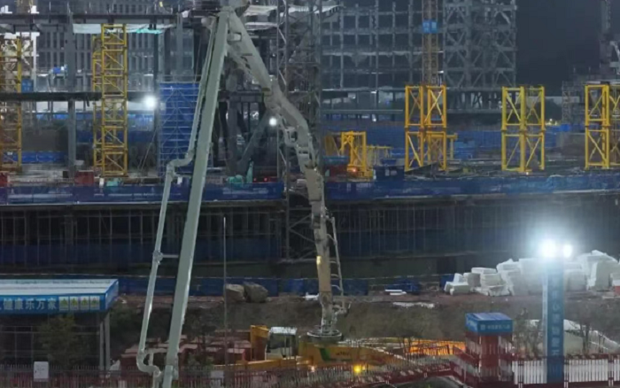 凌晨三点的重庆两江新区 蓝莓TV,徐工72米泵车展臂高空,20辆新能源搅拌车穿梭往来—这不是科幻电影场景,而是徐工混凝土成套化装备助建重庆赛力斯全球汽车公园的火热夜战场面。
