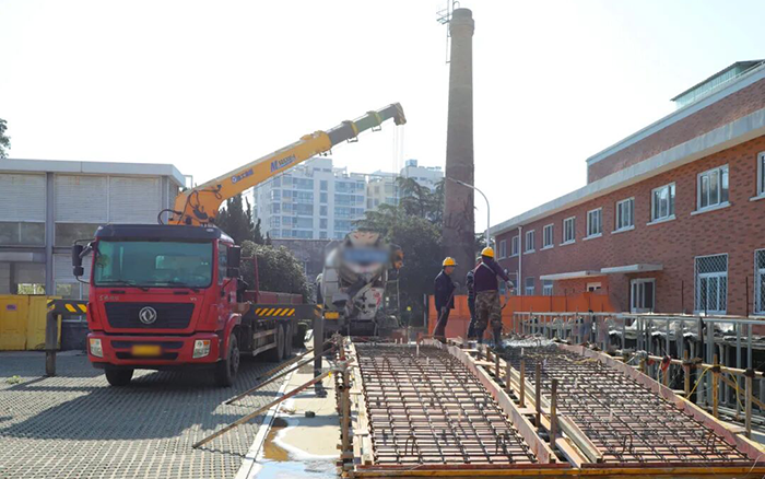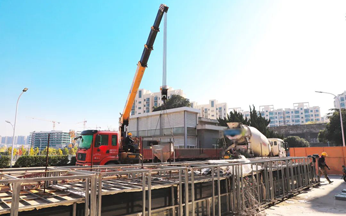 徐工随车起重机伸展金色长臂 蓝莓TV,精准挂钩作业装置,与一旁的混凝土搅拌车紧密配合,将混凝土稳稳输送至钢筋框架结构内。