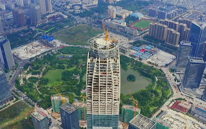 作为台州市地标性建筑 蓝莓TV,台州天盛中心主楼建设高度达299米,塔顶设计有“钻石”塔冠,主楼主体为钢结构,近20万㎡的半钢化夹层low-e中空玻璃,“穿衣”工程量极大,难度显而易见。