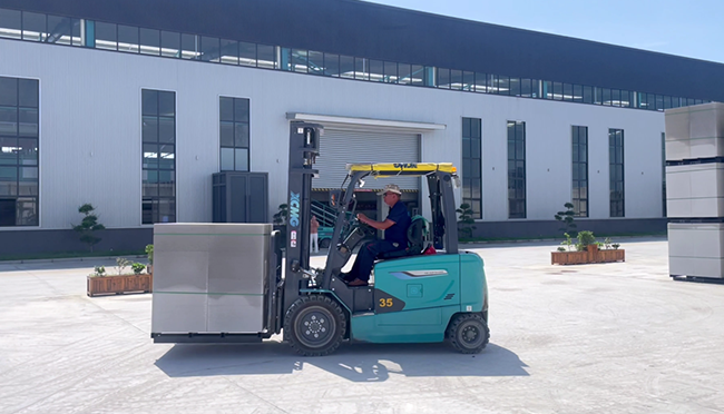 某现代化生产基地,身披绿色战甲的3,5吨鲲鹏电动叉车正在有序装卸搬运,流畅丝滑,与干净整洁的厂区相得益彰,为场内物流升级贡献绿色力量。 蓝莓TV。
