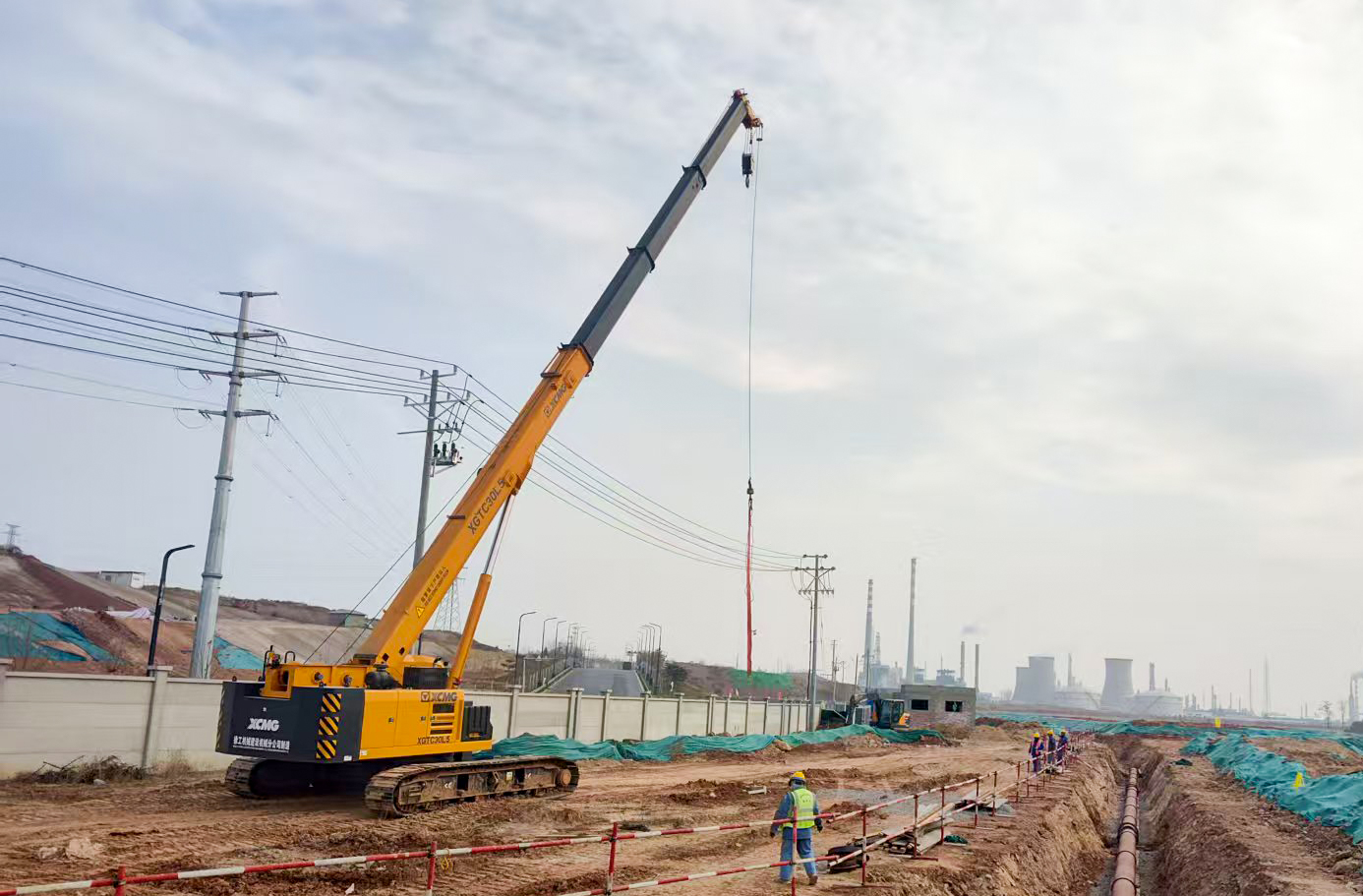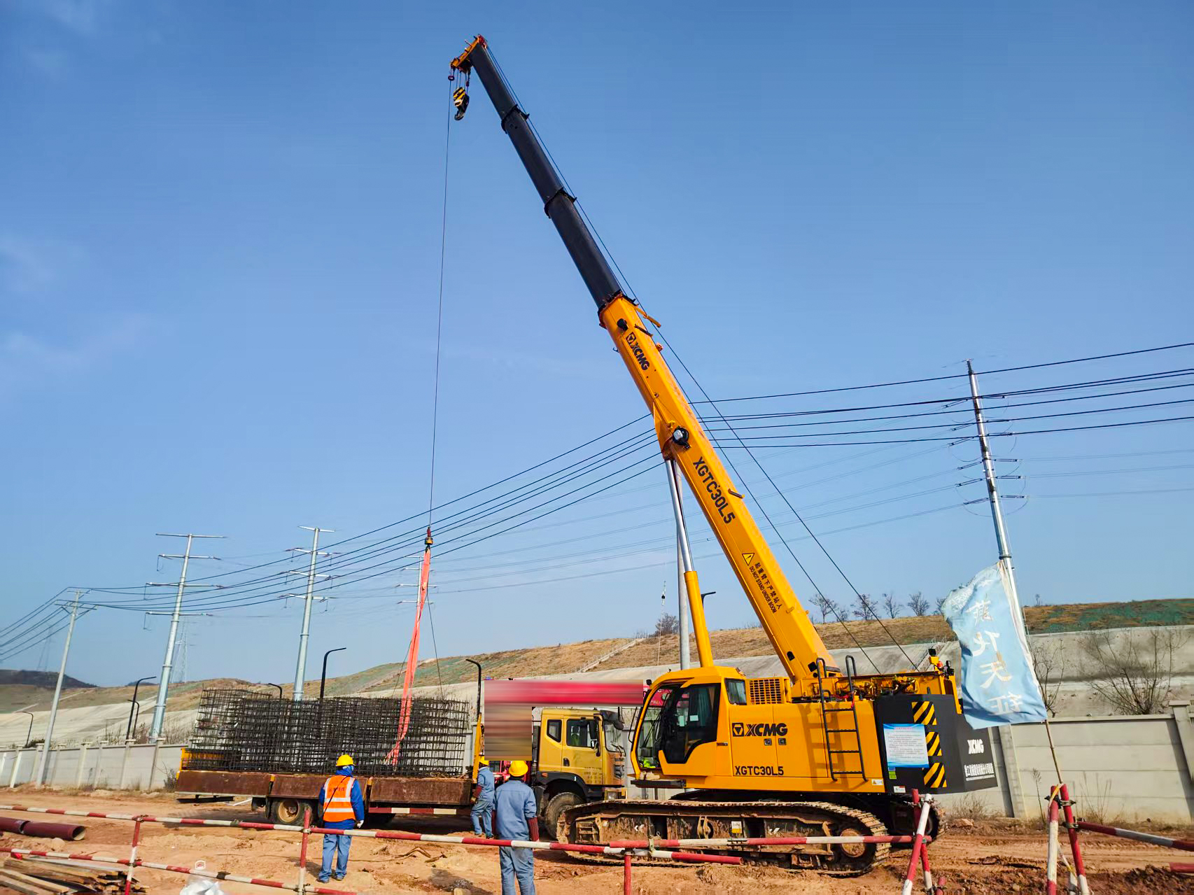 洛阳百万吨聚乙烯项目基础施工现场 蓝莓TV,XGTC30L5(30吨级)伸缩臂履带起重机正承担着关键工序——钢筋笼吊装。