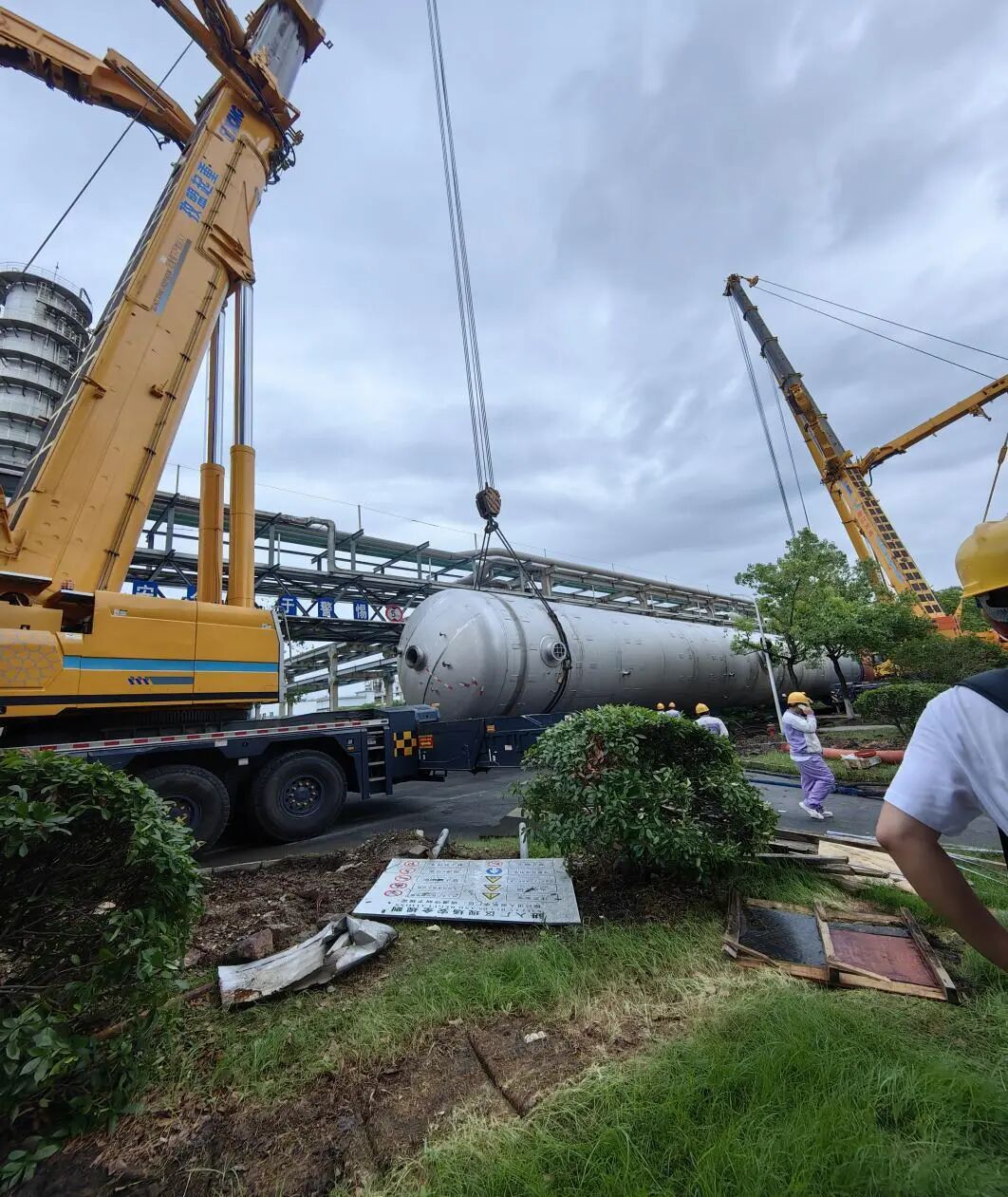 它们上演精密“接力合舞”:通过多机合吊、溜尾配合,在无法展开臂架的狭缝中,完成了设备的移位、调向、竖立与精准落座。